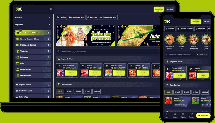 Na 7K BET, disponibilizamos uma ampla variedade de produtos de alto nível, incluindo Sportsbook, Apostas ao Vivo e jogos de Cassino, aliados a serviços de excelência, como suporte ágil, transações rápidas e seguras, e recursos de jogo responsável.